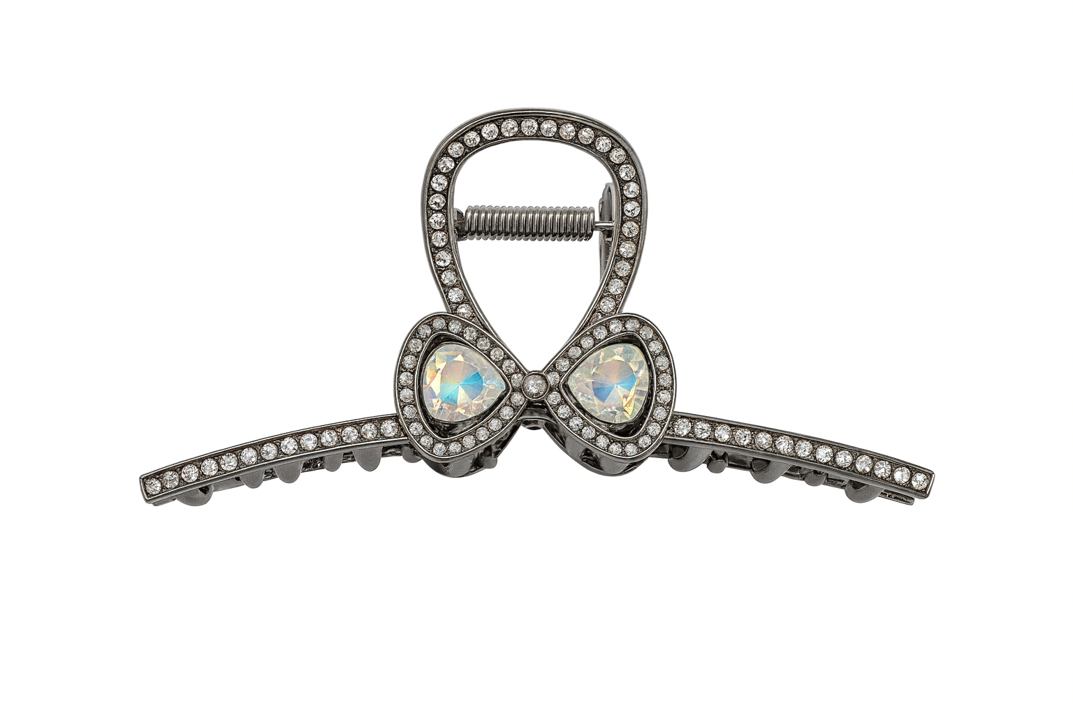 Deze prachtige haarclip combineert een elegante strikvorm met een moderne black metal finish. De schitterende kristallen en iriserende stenen zorgen voor een luxe sparkle die elke look compleet maakt.