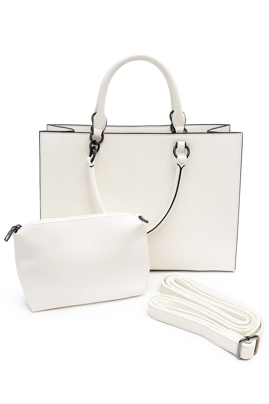Upgrade jouw everyday look met deze elegante witte tassenset. De set bestaat uit een ruime handtas, een bijpassende pouch én een verstelbare schouderriem – perfect voor iedere gelegenheid.